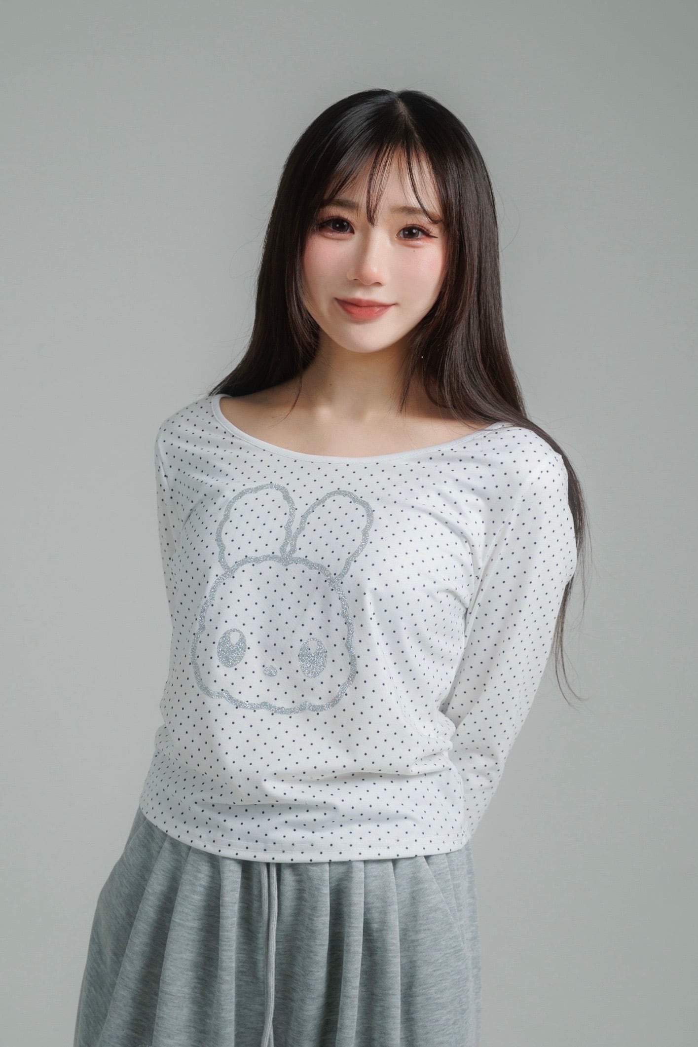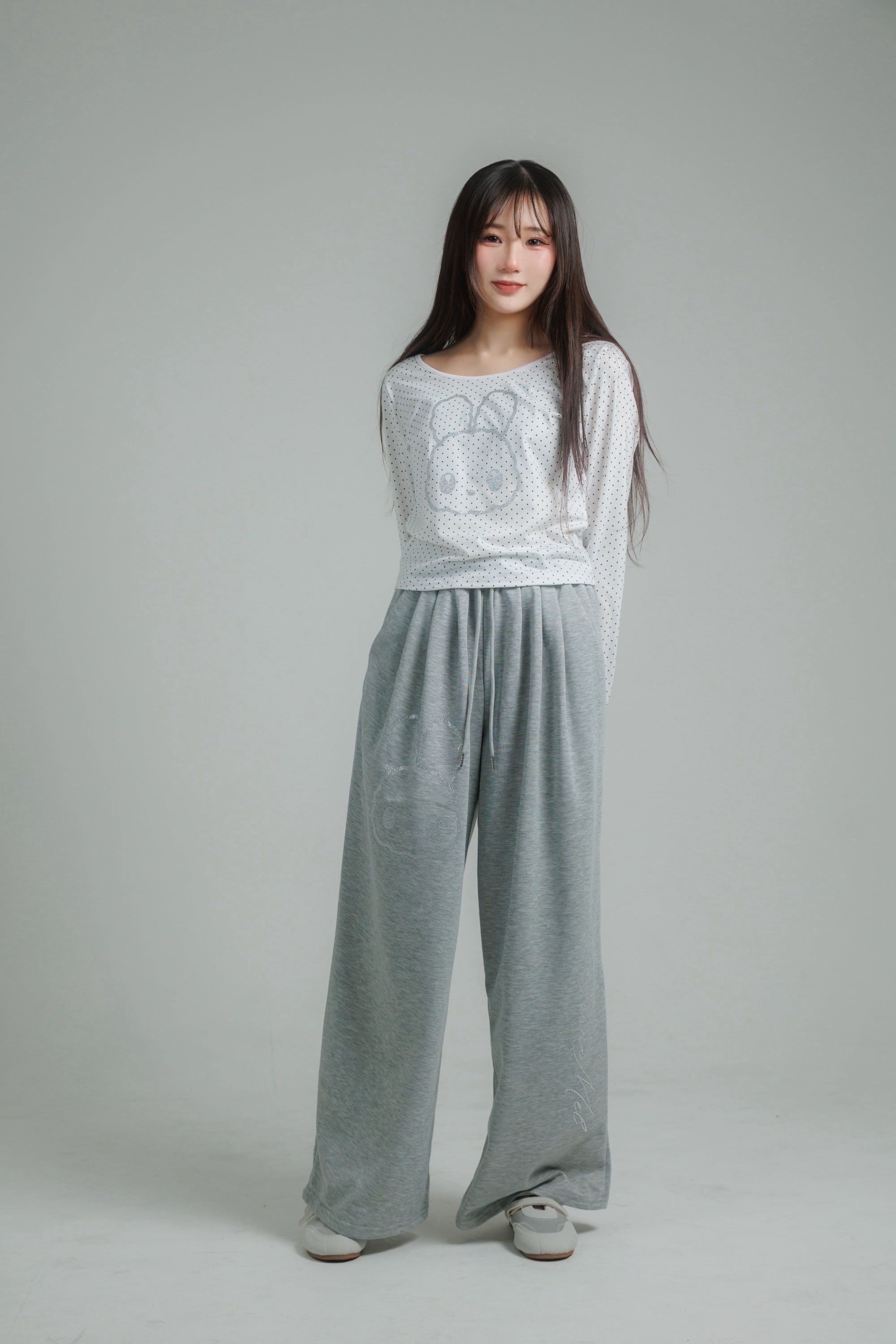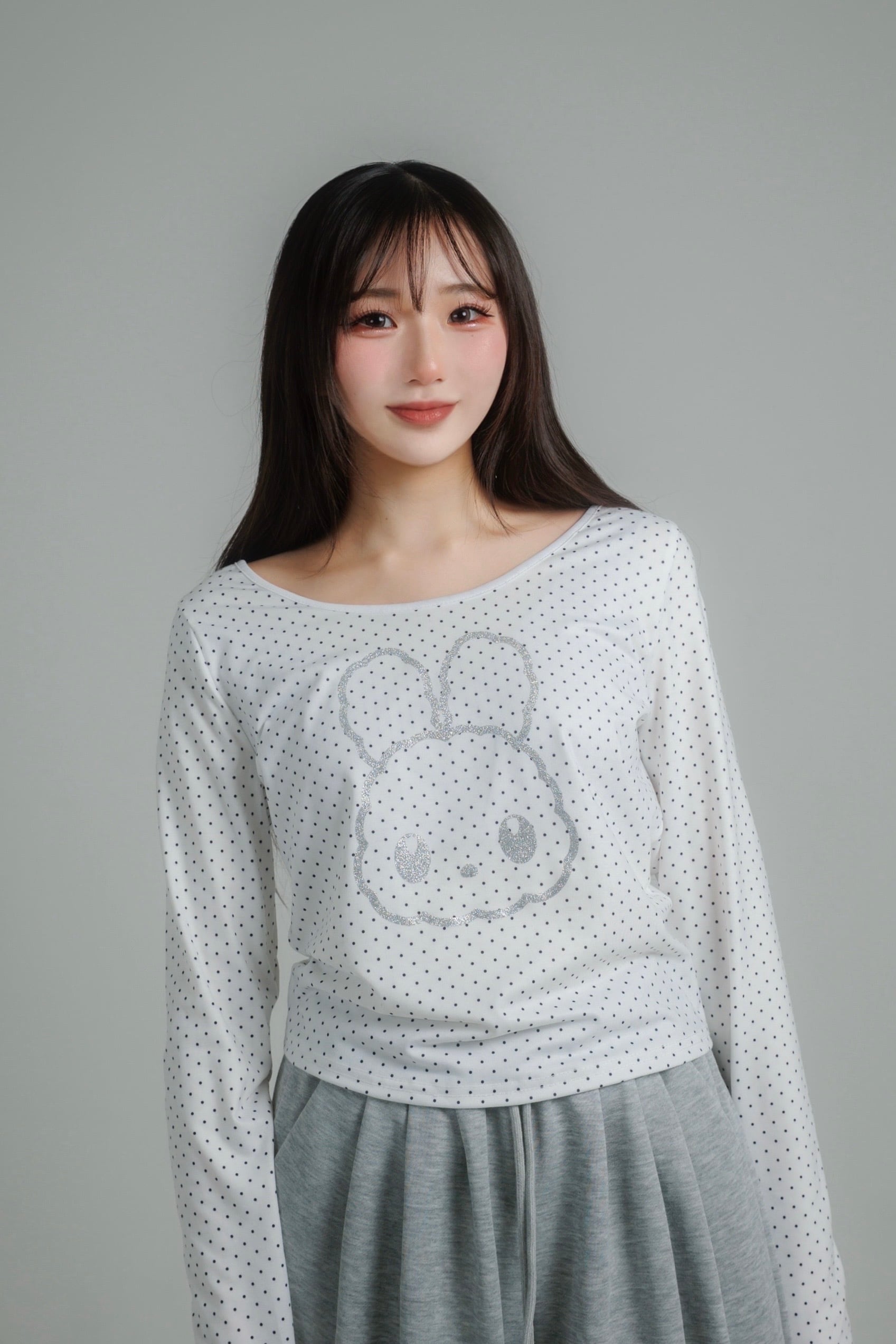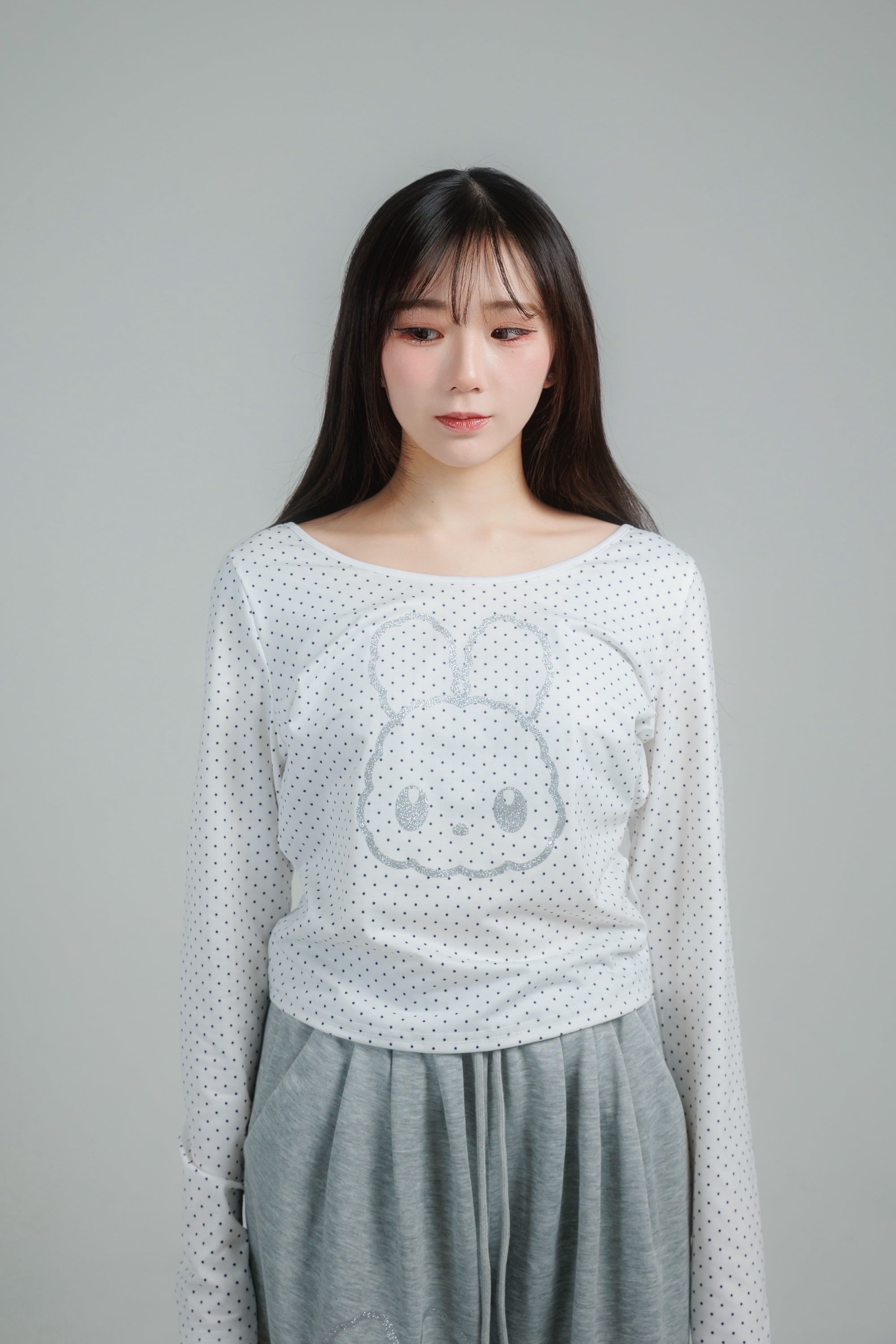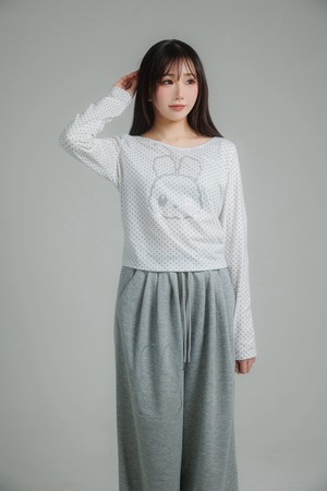 繊細なドット柄に、きらっと輝くグリッターのうさぎモチーフを重ねたロングスリーブトップス。