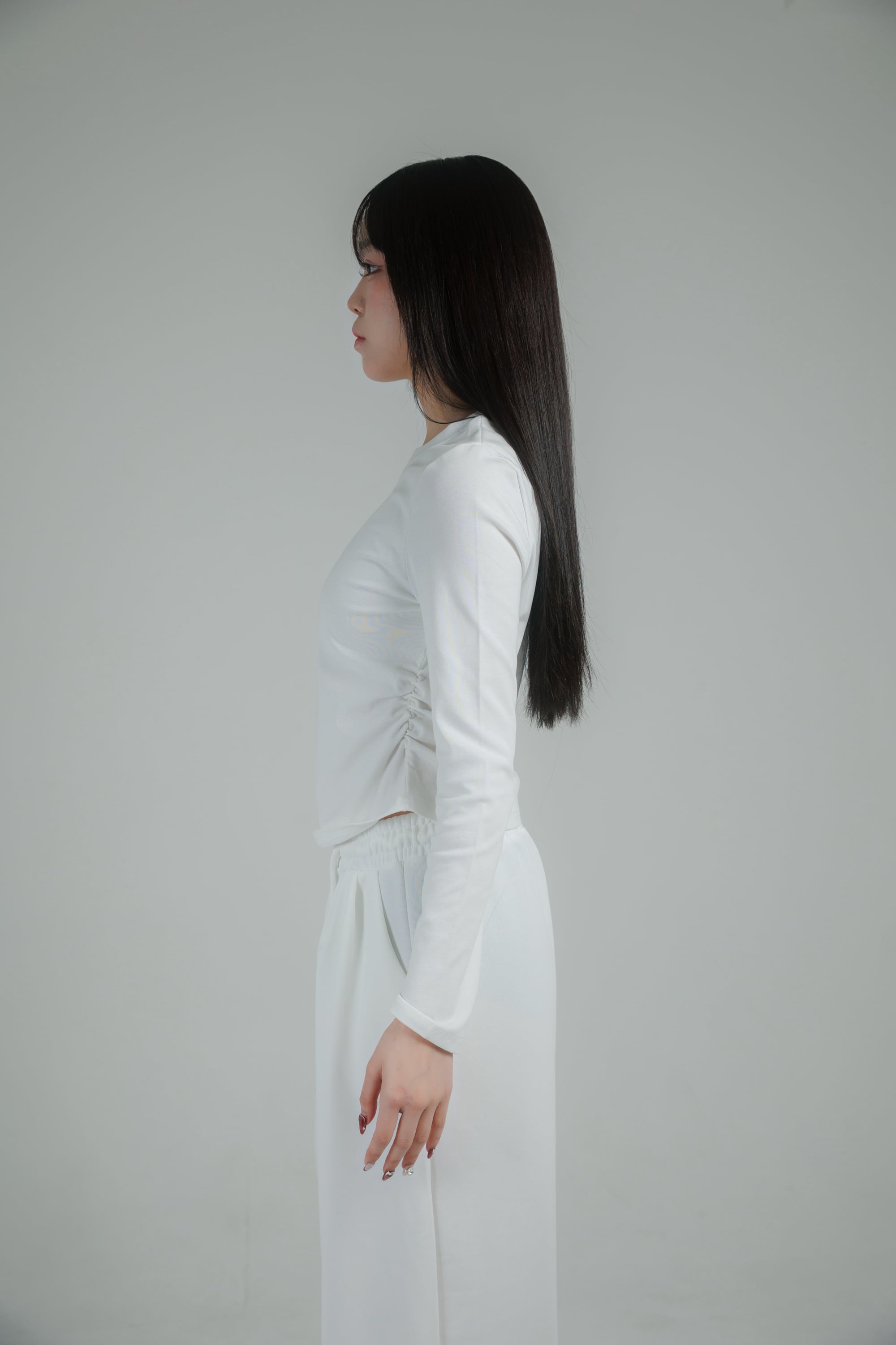 サイドにギャザーを施し、自然にウエストラインがきれいに見えるシルエットに仕上げました。