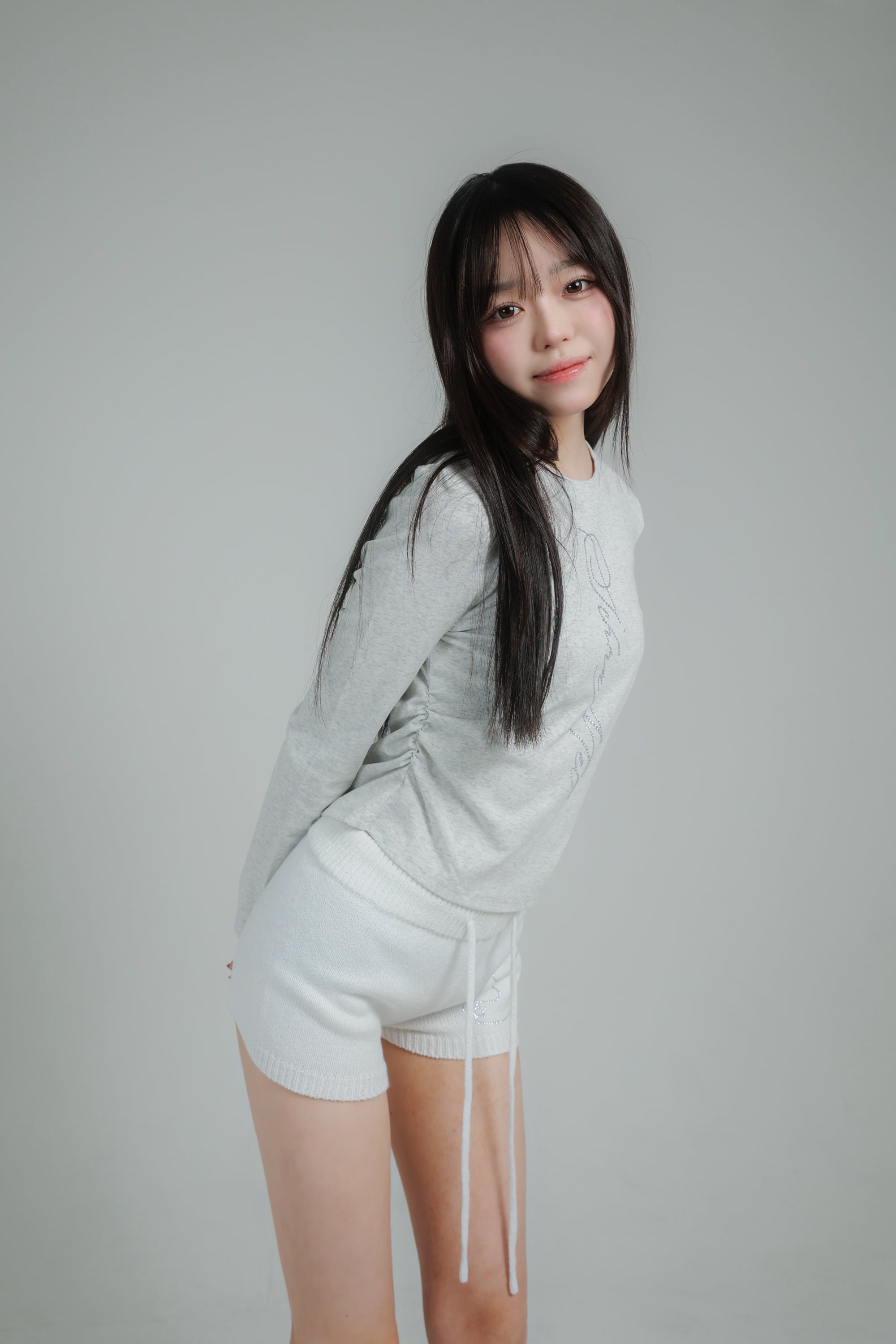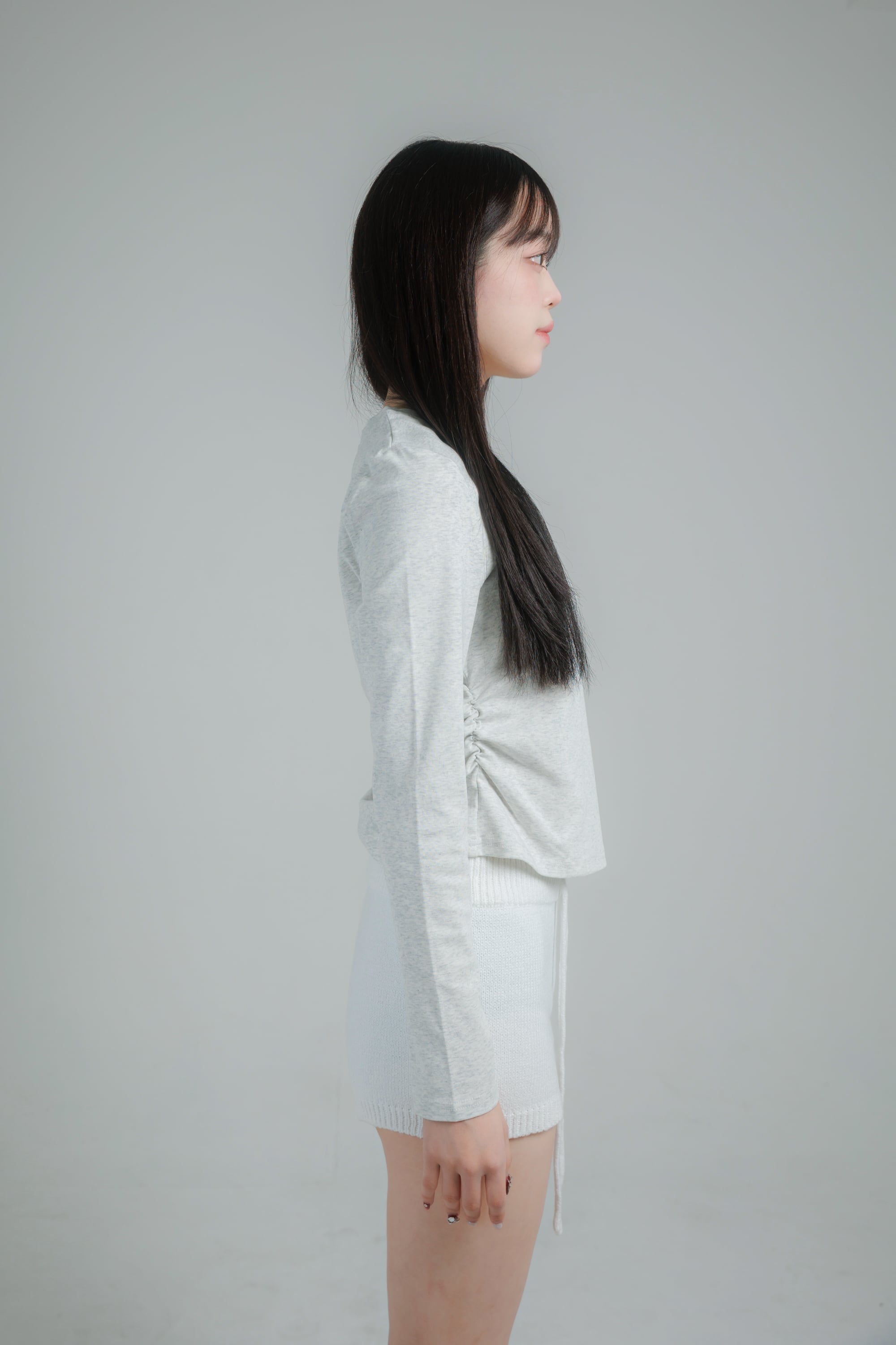 サイドにギャザーを施し、自然にウエストラインがきれいに見えるシルエットに仕上げました。