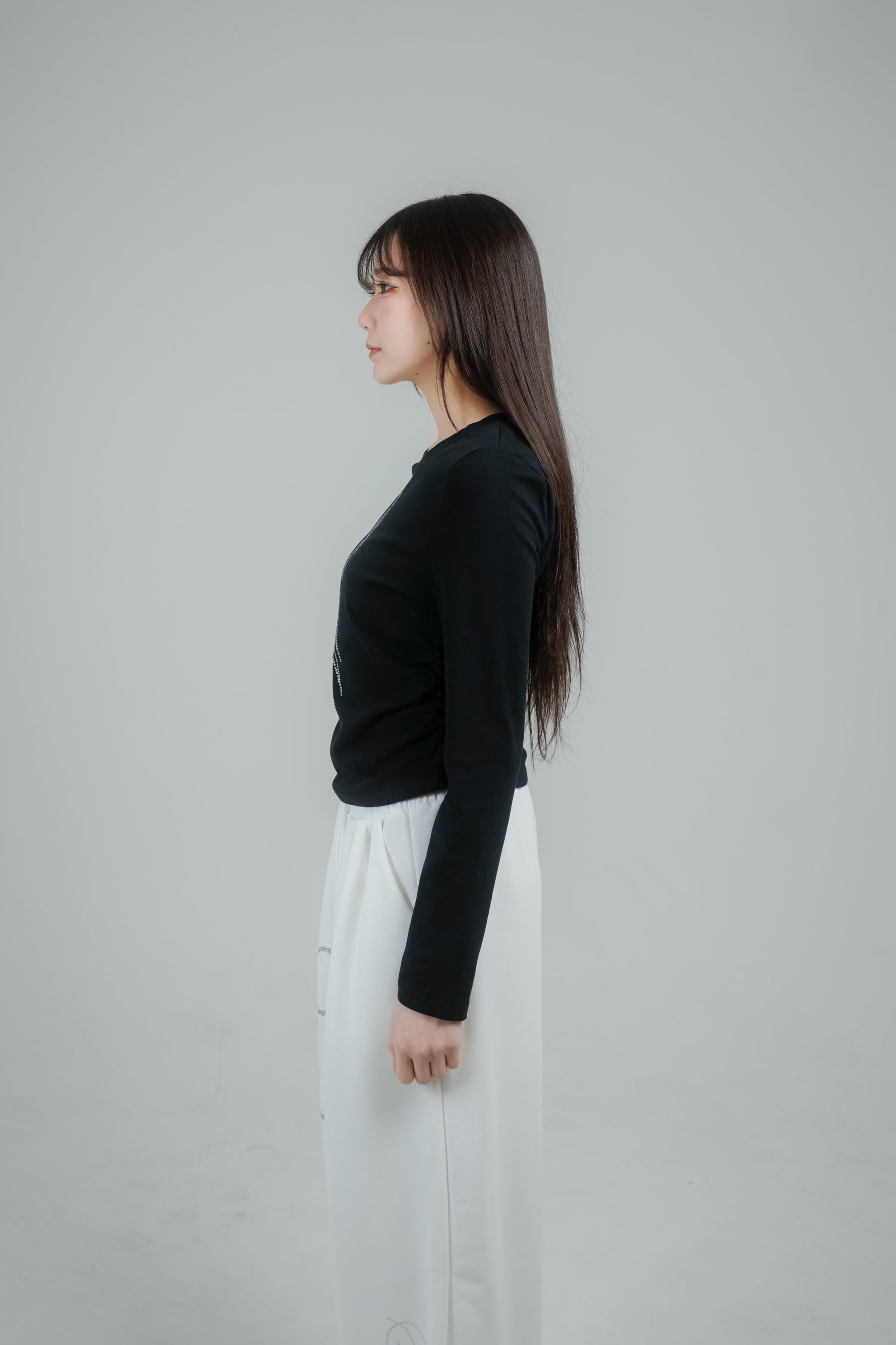 サイドに施したギャザーが自然にウエストラインをきれいに見せ、