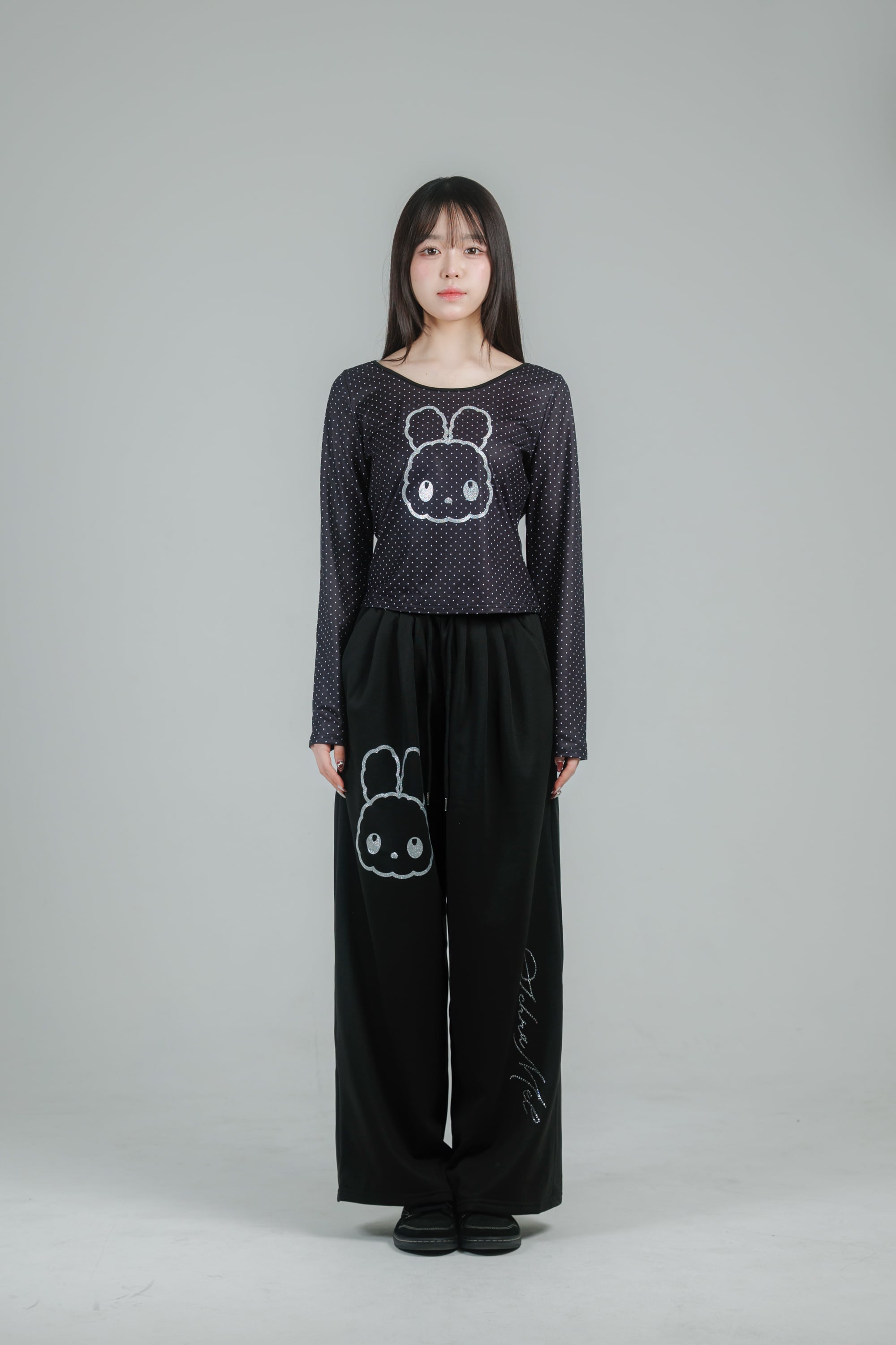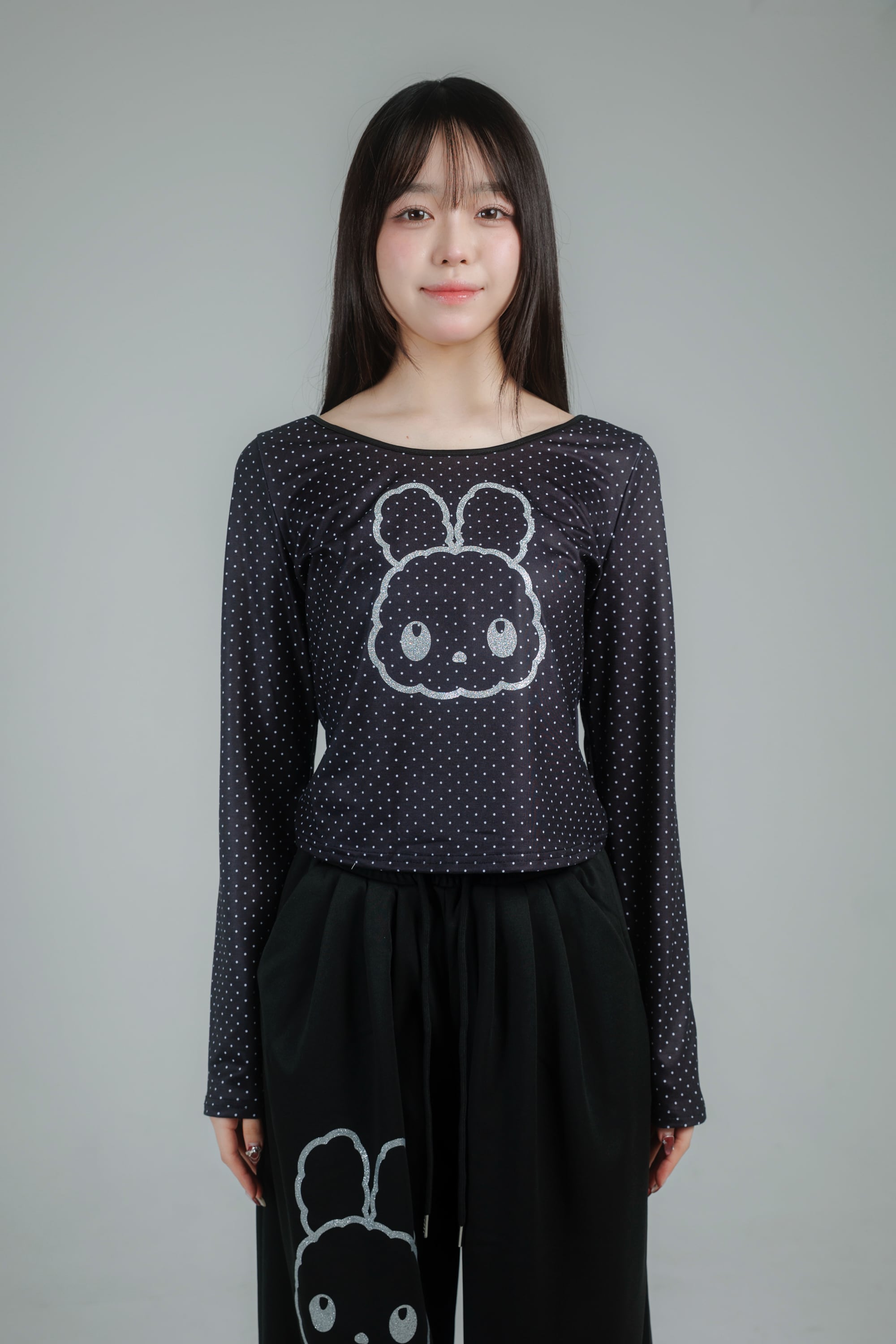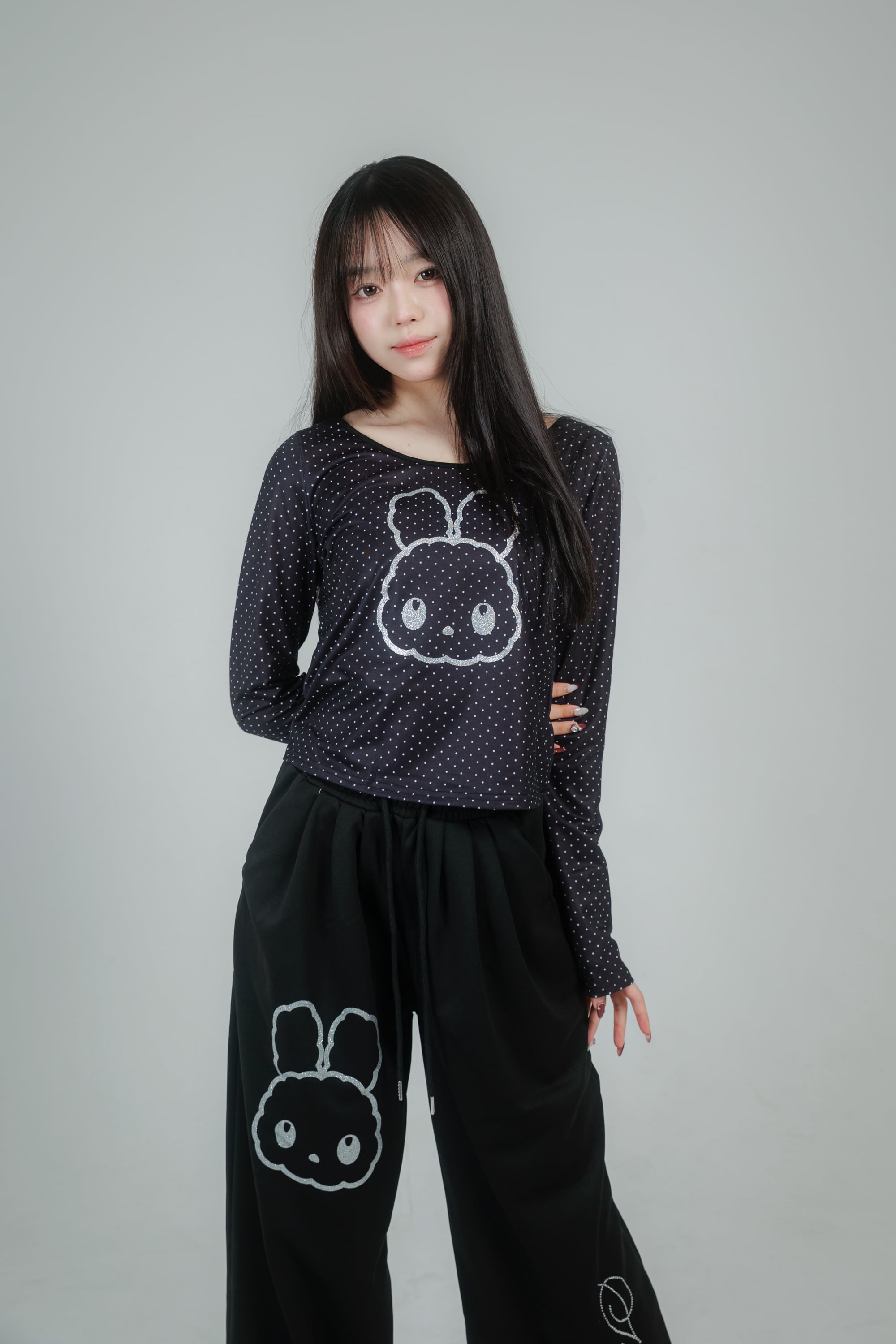 繊細なドット柄に、きらっと輝くグリッターのうさぎモチーフを重ねたデザイン。
