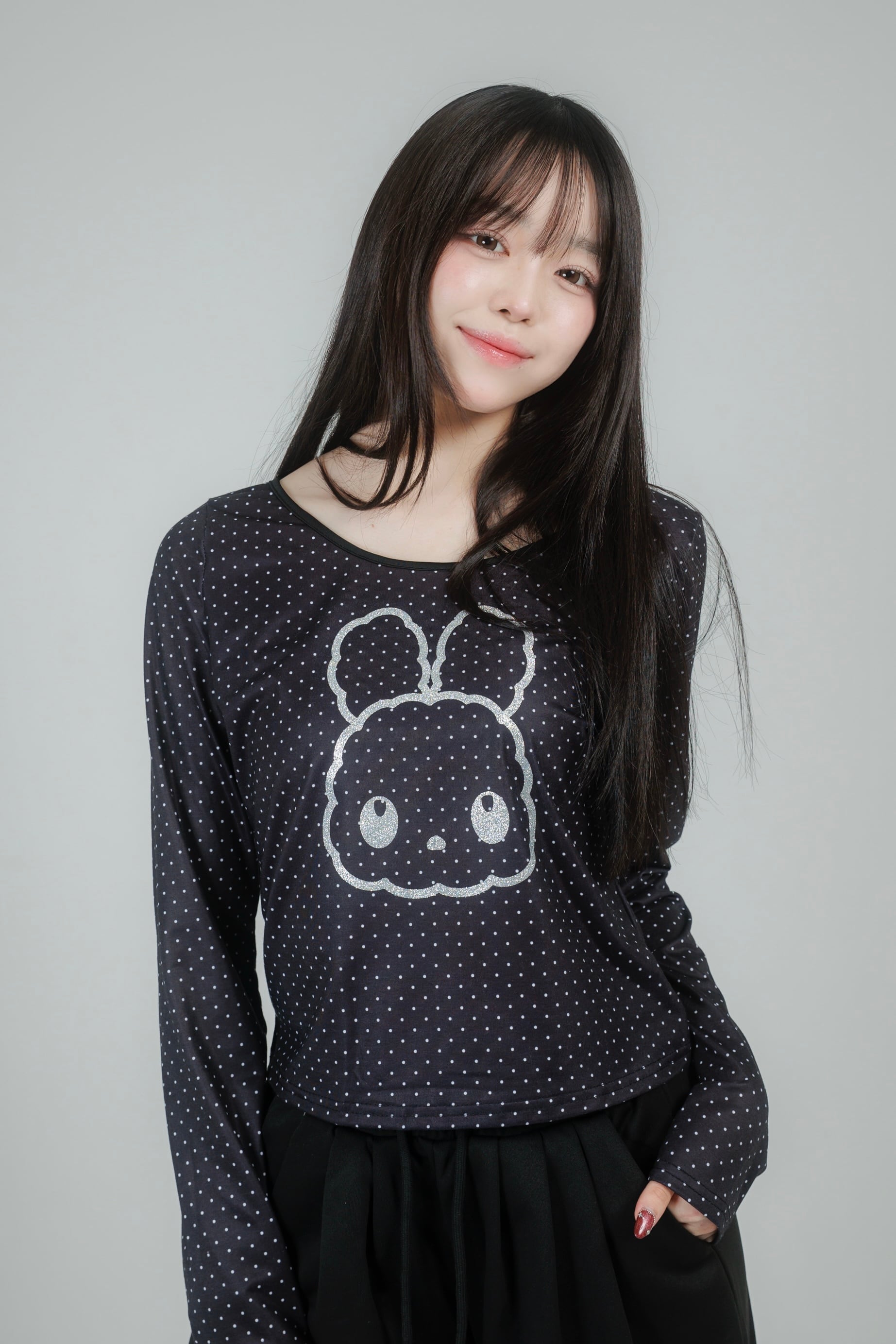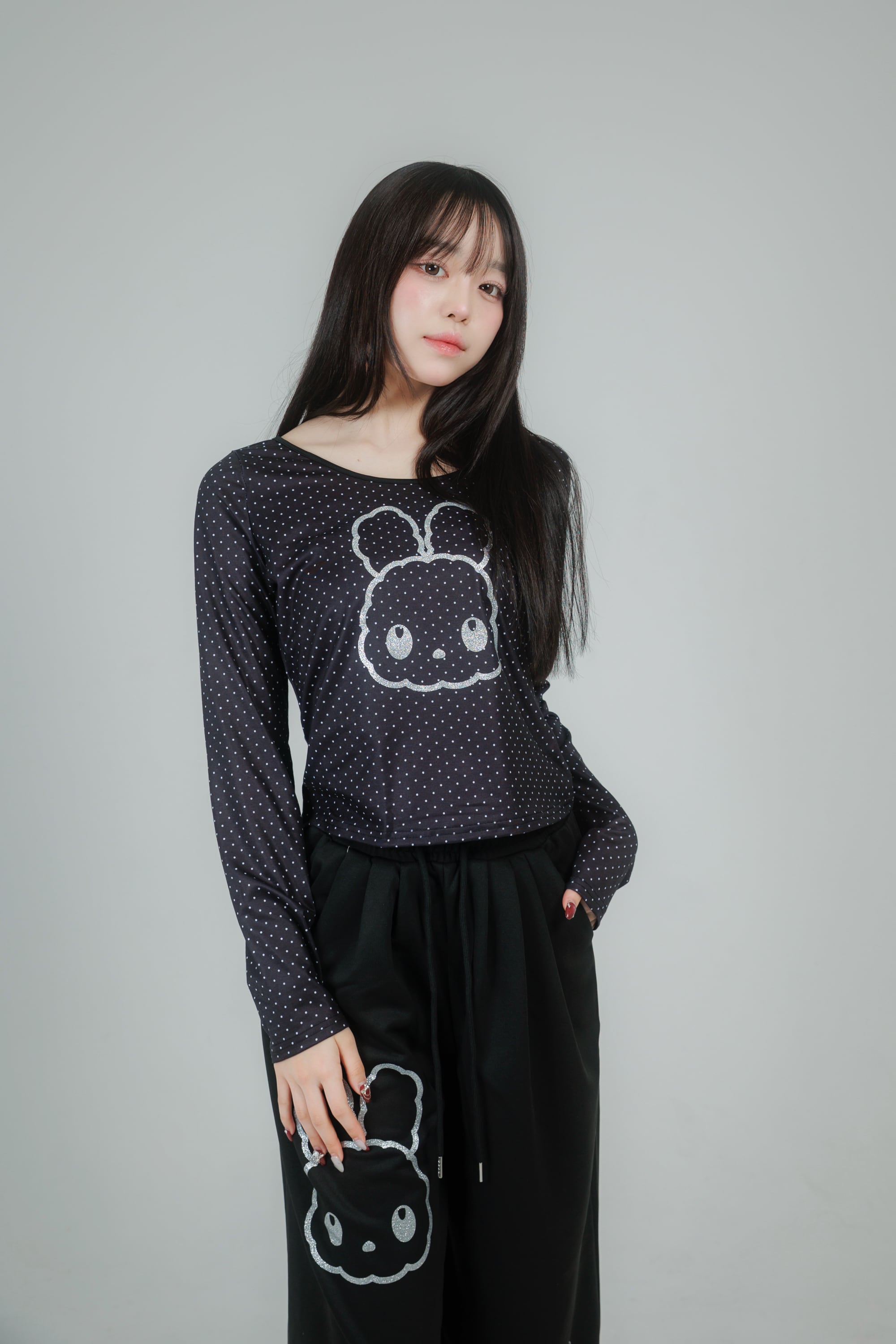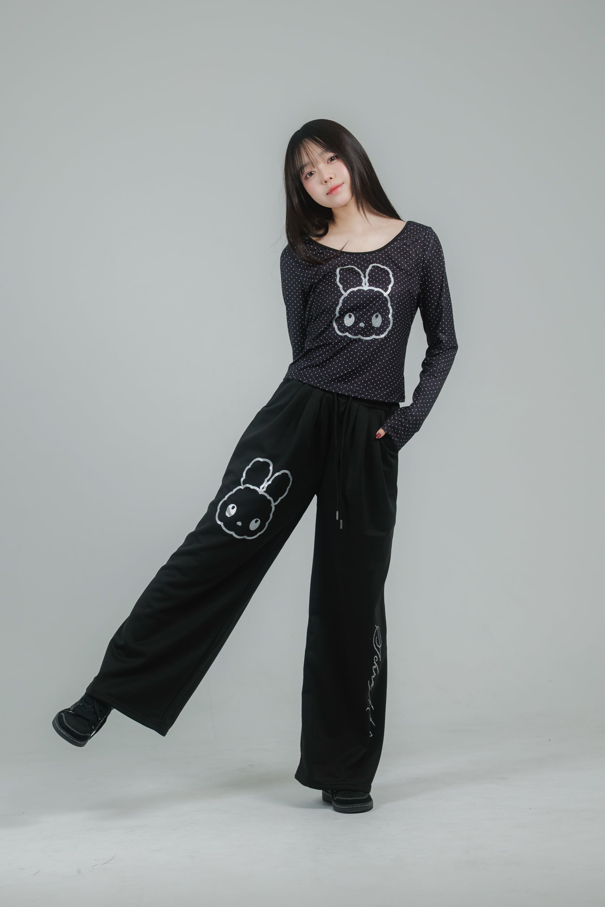 繊細なドット柄に、きらっと輝くグリッターのうさぎモチーフを重ねたデザイン。